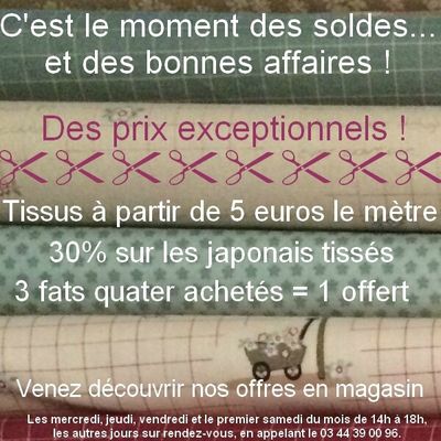 Du 22 juin au 1er septembre prix chocs sur de nombreux tissus -30% et - 50% profitez vite de l'offre. la boutique est ouverte le jeudi et vendredi de 14h à 18h et toujours sur rendez vous au 06 88 27 06 92